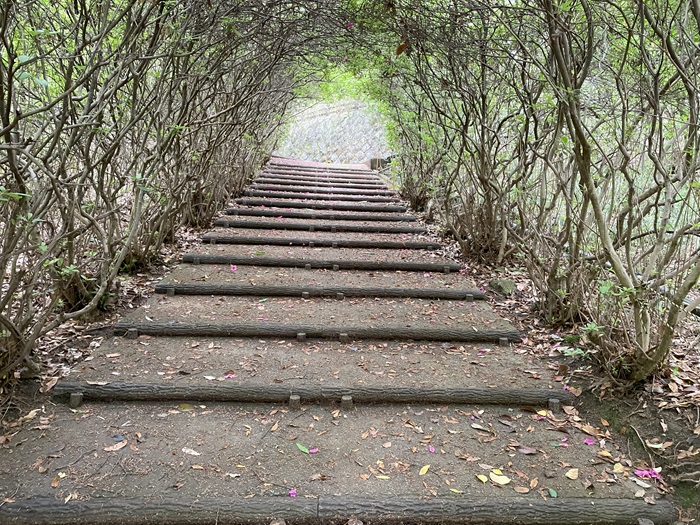 最初の階段。先程よりもやや勾配がきつくなりますが、まだかなり緩やか。ここでは完全に葉っぱが傘になって濡れることがありません。